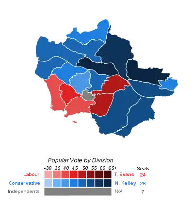 The council was left in no overall control, with neither party holding a majority of the seats and the balance of power falling to the seven independent councillors.[36] Of the independent councillors, five were former Conservatives who left the party over Kelly's leadership and two former Labour councillors.[37] Kelly said on 11 May that he had contacted former Conservative councillors to seek their support.[37] Evans said that Kelly's success in the election gave him the "right to make the first move" in seeking to control the council, and that Labour wouldn't seek independent support.[38]