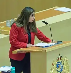 Left Party leader Nooshi Dadgostar speaking in the Riksdag on the day of Löfven's re-election, 7 July 2021