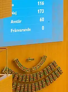 The no-confidence vote took place on 21 June, and Löfven was ousted by a majority of the Riksdag.[2][4] Because of the COVID-19 pandemic in Sweden only 55 members of the Riksdag were allowed to partake in a vote in the chamber. According to the Basic Laws of Sweden, there had to be at least 175 yes-votes from the members of the parliament for a Prime Minister to be ousted. Because of this, the "55-rule" was not applied for this vote and all 349 members of the Riksdag had to be present for the vote, unless symptoms of Covid-19 were present at the time. The decision to have all 349 members present was criticized by Swedish media personalities who meant this vote could become a superspreading event of Covid-19.[27] Some members of parliament were hesitant to the decision and called it "unpleasant" and "uncomfortable" that there was a slight risk of sick people not staying home during the vote.[28] Prior to the vote, the Speaker of the Riksdag called in the Parliamentary leaders of every party to discuss how the vote would take place. Johan Carlson, director general of the Public Health Agency of Sweden, said that the strategy that was put forward were well-thought-out and reasonable for the occasion.[29]