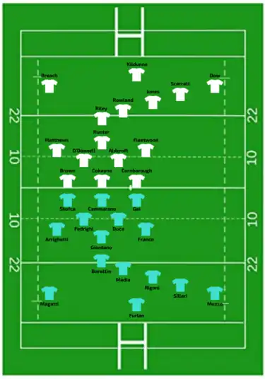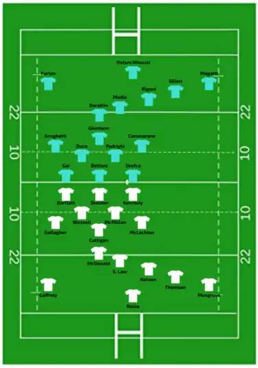 Report | Try: Rigoni (2) 7' c, 68' m Furlan (3) 10' m, 59' m, 79' c Arrighetti 40' +1 c Ostuni Minuzzi 42' m Con: Sillari (4/7) 8', 40' +2, 80' |