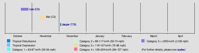 The season began with the formation of Cyclone Lola on October 19, thirteen days before the official start of the season. Three days later, it would rapidly intensify into a Category 5 severe tropical cyclone on the Australian scale, making it the strongest pre-season cyclone in a South Pacific cyclone season since Cyclone Xavier in 2006. In November, Cyclone Mai would form, peak as a severe tropical cyclone, and impact Fiji before dissipating. On December 2, the precursor disturbance to Cyclone Jasper would form before exiting the basin and entering the Australian basin a day later.