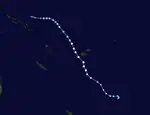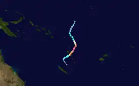 On October 19, the Fiji Meteorological Service (FMS) reported that Tropical Disturbance 01F had developed out of an area of low pressure, about 1295 km (805 mi) to the northeast of Honiara in the Solomon Islands.[7][8] At this time, the system was located in an area favourable for further development, with warm sea-surface temperatures of 30–31 °C (86–88 °F) and low to moderate vertical wind shear.[7][9] Over the next few days, the system gradually moved southwestward before the FMS classified it as a tropical depression on October 21.[10] The cyclone drifted southward until an upper-level ridge forced the storm to the south.[11] During the next day, it intensified into a Category 1 tropical cyclone, resulting in the FMS naming it Lola.[12] Lola would rapidly intensify, becoming a Category 4 tropical cyclone on 12:00 UTC that day, peaking with maximum ten-minute sustained winds of 175 km/h (110 mph).[13] With convective rain bands wrapping into the circulation, the JTWC assessed Lola as having one-minute sustained winds of 215 km/h (130 mph).[14] At the same time, the FMS followed suit and upgraded the system to a Category 5 severe tropical cyclone.[15] Lola's eye quickly disappeared, signaling a phase of rapid weakening.[16] It would steadily weaken before making landfall in Sowan, around 03:00 UTC on October 25.[17] Lola would rapidly weaken, becoming a tropical depression on October 26, and degenerating into a remnant low as the JTWC issued their final advisory on Lola.[18][19]