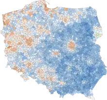 The process of election for the Sejm is through party-list proportional representation via the D'Hondt method in multi-seat constituencies,[20] with a 5% threshold for single party (KW) and citizen committees (KWW) and an 8% threshold for coalitions (KKW). National minority committees, such as the German minority, can apply to be exempt from the nation-wide threshold, and in such case participate in the d'Hondt seat distribution within their constituency, in this specific case Opole, regardless of the national share of votes.[21] Contrary to popular belief, minority committees are not guaranteed seats in the parliament.[22]