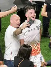 Declan Rice celebrates shortly after the end of the game
