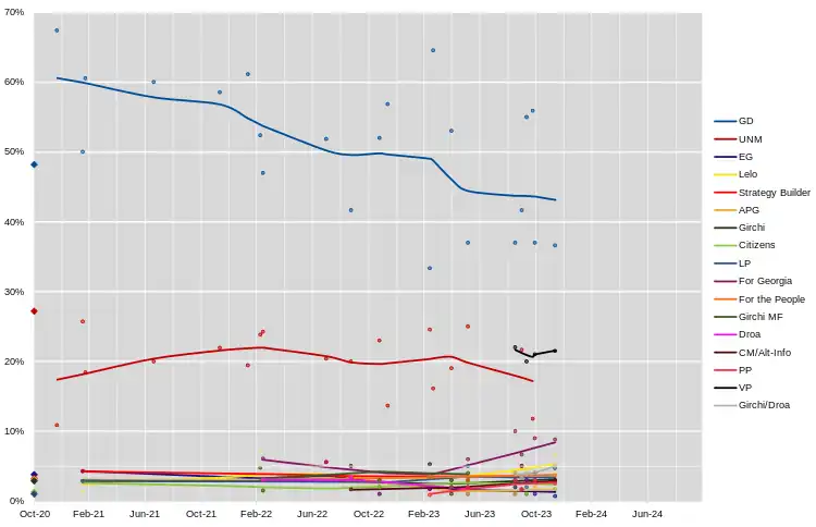 | Date | Sample size | Pollster | GD | VP | UNM | EG | Lelo | Strategy | APG | NPC-Girchi | Citizens | SLP | For Georgia | Girchi-Droa | Girchi-MF | Droa | For the People | CM/Alt Info | PP | No party | Others | N/A | Lead |