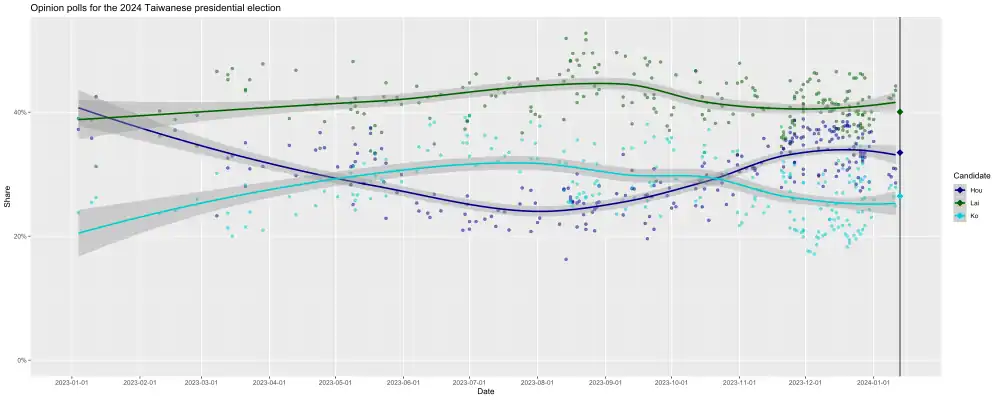 Throughout the election campaign, almost all polls have showed Vice President Lai Ching-te winning the election by a plurality, with the rest of the vote being split between the KMT and TPP.[52] Lai's lead increased in September 2023, when Terry Gou announced his own independent bid for the presidency.[53] In August 2023, amid campaiging, Lai Ching-te went to Paraguay for an official visit in his capacity as Vice President, with two stopovers in the United States.[54] Lai insisted he was not campaigning during the trips.[55] In late October, China opened an investigation into Foxconn, after Chinese tax authorities conducted an audit of the company's subsidiaries in the Guangdong and Jiangsu provinces.[56] Within the final weeks preceding the election, Lai's lead narrowed as the publication of opinion polls ceased.[57]