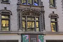 In the original design, the central entrance on the first floor contained a stoop, with two-part windows on either side.[20] The annex also originally had a pair of windows at ground level. The first floor was clad in stone during a 1918 renovation, and the original windows were placed with large display windows.[19] On the second floor, in the central bay of the original building, is a canopied ogee arch with a tripartite window and ornamental reliefs in the tympanum. The other second-story windows have rectangular windows, which are topped by lintels shaped like ogee arches. On the third story, the original central bay contains a tripartite window, while the other windows have rectangular windows with small sills and decorative lintels. In the original design, a molded band course made of stone stretched horizontally between the third and fourth stories.[17][19] The rectangular fourth-story windows were enlarged in 1939 so that they extended downward into the band course. There is a modillioned stone cornice above the fourth floor.[19]