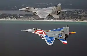 - ↑ The MiG-29 (29 + 10) is flown by the commander of Luftwaffe Jagdgeschwader 73 "Steinhoff", from Laage, Germany. It is in formation with a U.S. Air Force McDonnell Douglas F-15C-33-MC Eagle (serial 82-15) over the Gulf of Mexico during a joint training exercise on 14 May 2003.