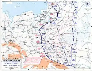 Map showing the operations on the Eastern Front during 1915, showing the Second Army located just to the west of Warsaw at the start of the year, and then just north of Minsk at the end of the year