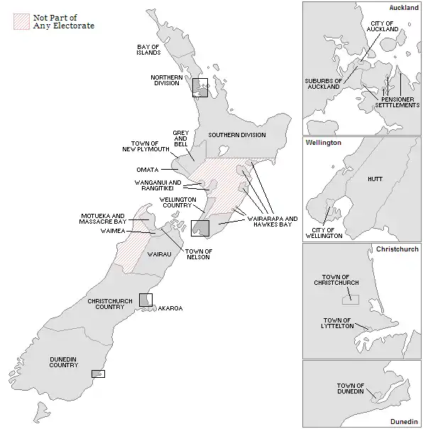 The turnover of MPs was very high in the 2nd Parliament, with 32 by-elections and a supplementary election being held. This situation was partly the result of a redistribution of boundaries to seven electorates, and the creation of four new electorates – agreed upon in the Electoral Districts Act, 1858, with the total number of MPs in Parliament rising from 37 to 41, and the number of electorates rising from 24 to 28. The northern portion of the Northern Division electorate was split off and became the electorate of Marsden.[27] The Wairarapa and Hawke's Bay electorate was split into two separate components, Wairarapa and County of Hawke. All the previously unincorporated areas in the lower North Island were divided between Wairarapa, County of Hawke, Wanganui and Rangitikei, and Wellington Country.[27]