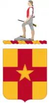 The 307th's distinctive unit insignia was approved on 11 January 1927, and its coat of arms was approved on the next day. Both were rescinded on 17 February 1959. The distinctive unit insignia included a 1 1/8 in (2.86 cm) gold colored metal and enamel device, which consisted of a shield with a red cross with a yellow star in the center, and a red and gold scroll below the shield, which was inscribed with the regimental motto, "Perseverandum". The shield symbolized the United States Cavalry, the cross, similar to that on the colonial seal of Virginia, represented the unit's Virginia assignment, the red symbolized its World War I field artillery service, and the star represented service in Texas. The motto was Latin for "Persevering", and was based on the motto on the reverse of the Great Seal of Virginia. The 307th's coat of arms was similar to the distinctive unit insignia except that it added the Organized Reserve crest, a Minuteman, and omitted the motto.[5]