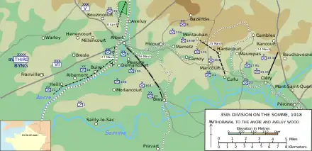 On 29 June the last of the dispersed artillery rejoined the division, and by 2 July was en route to Bouquemaison, 19.5 miles (31.4 km) north of Albert. The division's engineer and pioneers were attached to the 29th, 48th and 4th Divisions, and some of the division's officers reconnoitred the area north of Albert for a planned division attack there as part of the Somme battles. The division was now part of VIII Corps of Third Army. On 10 July these plans were cancelled, and the division was transferred to XIII Corps and marched south as part of the corps reserve, with the division headquarters at Morlancourt, 3.5 miles (5.6 km) south of Albert.[13] Except for a brief period, the division was not to be deployed as a whole during its time on the Somme. On 14 July the 105th was placed under orders of the 18th (Eastern) Division, and the 106th Brigade under the 9th (Scottish) Division in spite of the corps commander's reluctance for this type of deployment.[14]