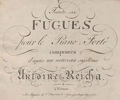 36 Fugues, sometimes assigned opus number 36,[1] is a cycle of fugues for piano composed by Anton Reicha. It was first published by the composer in 1803[2] and served as an illustration of a nouveau système (Fr. "new system") Reicha invented for fugue composition. This system involved, among other things, extensive use of polyrhythms, derived from traditional music, and fugal answers on any and all scale degrees, rather than just the dominant, which was standard at the time.