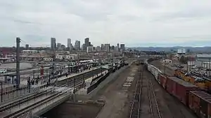![]() 38th & Blake station platforms and the Denver skyline as seen from the station's pedestrian bridge | |||||||||||