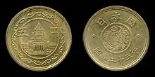 During the Taishō era the production of five yen coins was impacted by World War I as a gold embargo was imposed in 1917 by the United States. Even though this embargo was later lifted in June 1919, the Japanese government continued it by importing gold heavily to re-enforce the gold reserve of the Bank of Japan. Government officials at the time had the opinion that no inflation could take place so long as the percentage of gold cover had not been lowered.[11] This embargo was not absolute however, as it was recorded that some gold coins were paid out between 1920 and 1928 in very small amounts.[12] The gold embargo was later lifted in January 1930, only for it to be re-imposed on December 31, 1931.[12][13] Five yen coins were last minted in gold during this brief time to act as a reserve for gold certificates. None of these coins were in general use afterwards as the medium of commerce consisted of nonconvertible 5 yen banknotes.[14]