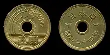 Almost 20 years would pass before the Japanese government authorized the production of a new five yen coin. These new coins were first struck in 1948 and are made of a brass alloy consisting of 60 to 70% copper, and 30 to 40% zinc.[15][16] Using this type of alloy combination is now a remnant from when World War II era weapons were scrapped to produce the coins.[17] These coins feature a pigeon within a circle on one side and the National Diet on the other and were only minted for two years. Two different varieties were made in 1949 which included the old pigeon type coins, and new coins featuring a hole in the center. These first holed five yen coins use an old style Japanese script known as Kaisho.[15] The Japanese government added the hole in the center of the coin to save material costs.[18] The overall design of the coin featuring rice, water and a gear on the obverse, and tree sprouts on the reverse has not changed since this time. The final design which is minted today uses a modern style script which was first added in 1959.[15]