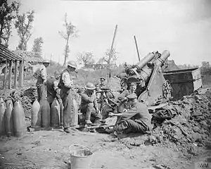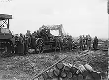 The ASC company was absorbed into the brigade's ammunition column on 25 April.[9] The battery was reassigned to VII Corps Heavy Artillery on 11 May.[10] When 96th Siege Bty arrived from the UK it took over 62nd Siege Bty's 9.2-inch howitzers in their emplacements on 25 May.[10][13] The battery's personnel then joined X Corps with Fourth Army on 8 June[10]