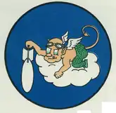 1. Approved 3 July 1943. Description: On a medium blue disc, border black, a devilish cherub, face arms, body, and barbed tail flesh colored, wings white, tongue and finger nails red, eyes and horns green, wearing leaf trousers yellow-green and aviator's goggles brown, leaning over edge of white cloud formation and dropping a gray aerial bomb, point to base with right hand.