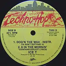 "6 in the Mornin'" is a song by American rapper Ice-T. Released in 1986 as the B-side of "Dog 'n the Wax (Ya Don't Quit-Part II)", the song is considered to be one of the defining tracks of the gangsta rap genre. It also appeared on Ice T's debut album Rhyme Pays in 1987.[1][2] The song was produced by Compton's Most Wanted associate the Unknown DJ.