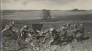 ![]() A 7.62 cm Infanteriegeschütz L/16.5 stuck in the mud of the trenches. | |