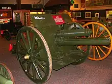 The US decided early in World War I to switch from 3-inch (76 mm) to 75 mm calibre for its field guns. Its preferred gun for re-equipment was the French 75 mm Model of 1897, but early attempts to produce it in the US using US commercial mass-production techniques failed, partly due to delays in obtaining necessary French plans, and then their being incomplete or inaccurate, and partly because US industry was not equipped to work to metric measurements.[2] By 1917 US firms had produced 851 QF 18-pounders for export to Britain. Hence production of a 75 mm version offered a simple interim solution, being basically a copy of the British QF 18-pounder rechambered for French 75 mm ammunition, utilizing existing production capacity.[3] It remains very similar to the 18-pounder, the main visible difference being a shorter barrel with straight muzzle.