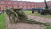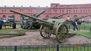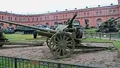 The M1933 was a transitional type between the modernized 76 mm divisional gun M1902/30 and the 76 mm divisional gun M1936 (F-22). It followed an established pattern of mating a new gun barrel with an existing carriage from the 122 mm howitzer M1910/30. The gun was equipped with a box trail, unsprung spoked wheels, gun shield, hydro-pneumatic recoil system and was chambered in the standard 76.2 × 385mm R. Despite being considered a stopgap until the adoption of the M1936, some were still on hand during the opening phases of World War II. The German designation for the gun was 7.62 cm FK 298(r), but it is not known if the Germans used the type.[1]
