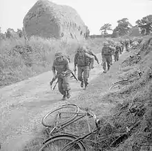 During the winter of 1942–43, the army overhauled the training of recruits. The 76th Division, along with the 48th Infantry and 77th Infantry divisions, was changed from a "Lower Establishment" unit to a "Reserve Division".[19][20] On 20 December, the division was renamed the 76th Infantry (Reserve) Division, becoming a training formation in the process.[1][19] These three divisions were supplemented by a fourth training formation, the 80th Infantry (Reserve) Division, which was raised on 1 January 1943.[21] The 76th Infantry (Reserve) Division was assigned to Eastern Command, and moved to Norwich.[18][22] Soldiers who had completed their corps training, were sent to these training divisions.[23][lower-alpha 2] The soldiers were given five weeks of additional training at the section, platoon and company level, before undertaking a final three-day exercise. Troops would then be ready to be sent overseas to join other formations.[23] Training was handled in this manner to relieve the "Higher Establishment" divisions from being milked for replacements for other units and to allow them to intensively train without the interruption of having to handle new recruits.[22] For example, the 9th Battalion, Dorsetshire Regiment provided recruits to other battalions within the regiment as well as the Royal Norfolk Regiment.[24] During this period, command of the division changed several times. On 21 December 1943, Ozanne was replaced by Major-General Colin Callander who in turn was replaced by Major-General John Utterson-Kelso on 13 March 1944.[1]