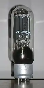 The 845 power triode is a radio transmitting vacuum tube which can also be used as an audio amplifier and modulation tube. Typically, the plate is machined from solid graphite in order to accommodate high power dissipation (up to 100 watts) and voltage. Some current production 845 tubes have metal plates.