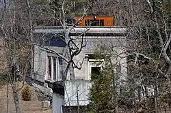 Astronomer Carl Sagan bought it in 1981, on returning to Cornell from several years in Los Angeles making the documentary Cosmos.[2] He used the complex as a residence for many years, and looked for an architect to help him renovate it. Eventually, he hired Atelier Jullian and Pendleton, whose principal, Guillermo Jullian de la Fuente, had been a student of Le Corbusier. The architects designed a new, separate residence for Sagan in Cayuga Heights, and prepared an extensive, two-stage redesign plan for the tomb to turn it into a study for him and his wife, Ann Druyan. Mensch's additions were demolished, with the exception of the new entry staircase. New windows and skylights were added. On top of the tomb, a small teak penthouse was built, inspired by "images of canal barges and of boats on the lake." The renovation, which took place from 1990 to 1992, was featured in a photo spread in Architectural Digest.[6] The second phase of the renovation, which was to include a series of additional buildings terraced above and below the tomb, were never built.[1]
