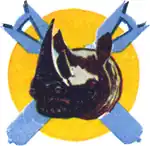 - ↑ Approved 22 November 1942. Description: Over and through a yellow disc, two light turquoise blue aerial bombs in saltire , surmounted by the head of a rhinoceros, proper.