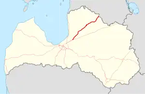 The A3 is a national road in Latvia connecting Inčukalns to Estonian border in Valka. The road is part of European route E264, and part of TEN-T road network of Latvia. After the border, the road turns into Estonian National Highway 3, which leads to Jõhvi in northeastern Estonia. The length of A3 in Latvian territory is 122 kilometers. The road leads through the scenic Gauja National Park. Currently A3 has 1x2 lanes in full length. A3 bypasses Valmiera, which is one of the biggest cities in Latvia. There aren't any plans to widen it in near future. Almost half of A3 was reconstructed in 2012. Speed limit is 90 km/h. The average AADT on A3 in 2015 was 5317 cars per day.