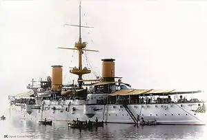 The ship's waterline armor belt had a maximum thickness of 5.9 inches (150 mm) amidships and tapered to 3.1 inches (79 mm) towards the ends of the ship. Between the main gun barbettes it covered the entire side of the ship up to the level of the upper deck. The barbettes, the conning tower, and gun turrets were also protected by 5.9-inch armor.[1] Her deck armor ranged from 1 to 2 inches (25 to 51 mm) thick.[2]
