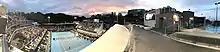 ASB Tennis Arena. The new Yock stand is in the centre, pool and gym facilities to the left