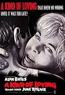 A Kind of Loving is a 1962 British kitchen sink[5] drama film directed by John Schlesinger, starring Alan Bates and June Ritchie.[6] It is based on the 1960 novel of the same name by Stan Barstow which was later adapted into the 1982 television series A Kind of Loving.[7] The film tells the story of two lovers in early 1960s Lancashire. It belongs to the British New Wave movement.