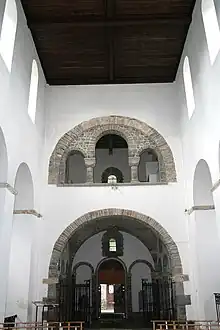 From the outset, the church had a western tower (since heavily rebuilt), a nave and two aisles five bays long, a transept and a chancel with an apse. It retains much of its original plan, with the exception of the chancel which was replaced by the current three-sided Gothic structure with lancet windows in the 13th century.[1] Originally, the ground floor of the tower, open to the nave, also contained a chancel which could be used for celebrating mass; an unusual feature particular for churches influenced by the architecture of the former Saint Lambert's Cathedral in Liège, which had a "counter-chancel" in its west end. A peculiarity is also the tribune on the first floor of the tower, open to the nave through three arches. During the Middle Ages an altar dedicated to Saint Michael was displayed here. Overall, the church displays strict geometrical volumes.[2]