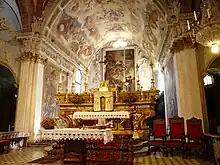 The apse ceiling and walls, above the choir, were frescoed by Bartolomeo Guidobono. On the left wall, is a depiction of Amedeo III of Savoy (1095-1148) founding the Abbey of Hautecombe in 1125. In the center, is a depiction of Umberto III of Savoy (1129-1189) joining the said abbey.