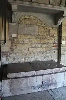 The earliest record of the cloister's presence dates it to the 10th century but its present arrangement is due to a renovation carried out between 1293 and 1313. The four sides are formed by small pointed arches on two sides and round arches on two others, supported by paired columns made of red Verona marble. On the northern side protrudes a quadrangular aedicule in which the ancient abbey well was located. On the perimeter walls of the ambulatories are placed sarcophagi and tombstones, among which the tomb of Giuseppe della Scala stands out, dating from 1313 and enriched by a lunette with a fresco by a painter of the Giotto school.[76]