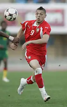 Benjelloun was first selected by Morocco during the 2007–08 season. He scored on his international debut, in a 4–1 win against Belgium in Brussels.[25] He was then selected for the 2010 World Cup qualifiers at the end of the season. Benjelloun scored in the first two matches, against Ethiopia[26] and Mauritania.[27]
