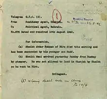 - ↑ Serkal, Isa bin Abdullatif Al. Telegram to British Resident, Bushire: 15 October 1925. IOR/R/15/1/279.