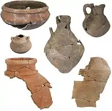 Remains of Iron Age I have been revealed mainly in Area A on the eastern edge of the saddle between the lower and upper mounds, where five strata belonging to this period have been excavated, as well as in Area F. In both areas, the pottery included many collared-rim jars, wavy band pithoi, small hemispherical bowls, a variety of vertical cooking pot rims, pyxides, painted carinated kraters, and pear-shaped jugs.