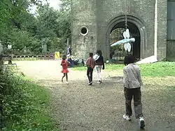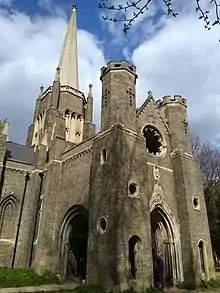 The chapel's eventual design avoided the temptation towards eclectic over-adornment sometimes associated with excesses of romantic mediaevalism, for which the derogatory term Gothick can be used. By satisfying the Cemetery Company Directors' preference for a low gothic style, William Hosking helped focus visual attention on the chapel's one elaborately designed elevation – the crenelated and decorated south elevation. This facade was set between two octagonal stair turrets, with newell staircases inside, illuminated by simple oculus windows. These led to dramatic viewpoints over Dr Watts' Walk, as well as to an internal viewing platform above an ogee arch with trefoil panels and quatrafoil. the whole effect created an almost theatrical backdrop to the south chapel lawn. As such it almost 'spoke' to the vista to which it was conspicuously aligned – a new axial walk in Dr. Watts' memory being laid out due south. Thus the chapel would be aligned with Dr Watts' and Lady Mary Abney's former place of residence – Abney House, Church Street.