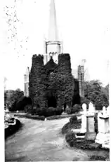 Hosking's Imposing chapel at Abney Park: notable as the first nondenominational Cemetery Chapel in Europe. Unfortunately, ivy obscured the ornate south facade of the Abney Park Chapel by the date of this photograph (Edwardian times) and repairs to the steeple led to a loss of its banding and some other simplification.