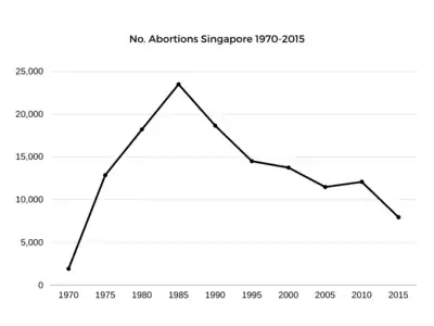 The legalisation of abortion was not influenced by, but helped to regulate Singapore's high population growth rate in the 1960s.[13][9] It was successful, with the population growth rate falling from 2.8% to 0.1% in the 15 years after its introduction.[14] There were 6,815 abortions carried out in Singapore in 2017, bringing the number to the lowest it has been since 1973.[15]