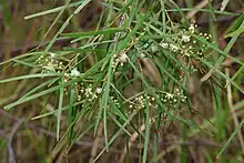 Acacia acrionastes is a spindly, glabrous shrub or tree that typically grows to a height of 2–8 m (6 ft 7 in – 26 ft 3 in). It has linear phyllodes that are 60–190 mm (2.4–7.5 in) long and 2–5 mm (0.079–0.197 in) wide and often narrower towards the tip. The flowers are arranged in a raceme 20–45 mm (0.79–1.77 in) long with 10 to 16 heads on a peduncle 3–6 mm (0.12–0.24 in) long, each head with 12 to 16 creamy yellow flowers. Flowering mainly occurs between July and August and the fruit is a leathery pod up to 100 mm (3.9 in) long and 8–10 mm (0.31–0.39 in) wide, containing up to nine seeds with a shiny black, club-shaped aril.[2][3][4][5]