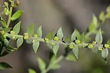 The bushy and prickly shrub typically grows to a height of 0.4 to 1.5 metres (1 to 5 ft)[3] with an erect or decumbent habit. The branchlets are terete with fine ridges and light to densely hairy. The sessile phyllodes have an ovate to lanceolate or elliptic shape and are 0.8 to 1.5 centimetres (0.31 to 0.59 in) in length and 2 to 4 millimetres (0.079 to 0.157 in) wide.[1] It blooms from July to October and produces yellow flowers.[3] The simple axillary inflorescences have globose heads containing 12 to 18 bright yellow flowers and have a diameter of 4 to 6.5 mm (0.157 to 0.256 in). Following flowering curved to twisted seed pods form with a length of 3 to 7 cm (1.2 to 2.8 in) and are 3 to 5 mm (0.118 to 0.197 in) wide.[1]