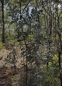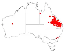 The bulk of the population is situated from around Collinsville in the north down to around Crows Nest in south and out to the west as far as around Tambo. It is found on stony hillsides as a part of open Eucalyptus woodland communities where it grows in shallow sandy soils or sometimes in deep alluvium.[2]