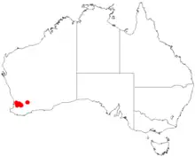 It is native to an area in the Peel and Wheatbelt region of Western Australia where it is commonly situated on scree slopes and along gullies and creeks growing in gravelly soils often containing laterite and in areas composed of sandstone.[1] The shrub has a distribution from around Brookton in the Boyagin Rock Reserve in the north down to around the Saddleback Timber Reserve close to Boddington in the south a couple of outlying populations, one near Hyden and the other around Narrogin where it is found as a part of low woodland communities where it is associated with Eucalyptus drummondii or open heathland communities often dominated by Dryandra carduacea.[2]
