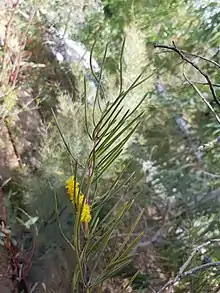 Miniritchie grows is a shrubby tree to a height of 1 to 6 m (3 ft 3 in to 19 ft 8 in)[1] and a width of 3 to 5 m (9.8 to 16.4 ft)[3] and has a many branched, rounded or flat topped habit.[1] It typically has several main stems. These are often twisted, and are always covered in distinctive red to brown coloured minni ritchi bark,[3] which peels in small curly flakes. Like most Acacia species, it has phyllodes rather than true leaves. These are rigid, round in cross-section with a diameter of about a millimetre, and up to nine centimetres long. It blooms between May and October[1] and produces yellow coloured flowers that are held in cylindrical clusters about three centimetres long and five millimetres in diameter, on stalks about two centimetres long. The pods are brown, up to eleven centimetres long, with tight constrictions between the seeds.