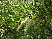 The wattle is slender shrub or small and spreading tree that grows to a height of about 5 m (16 ft). It has dry and membranous stipules that are usually less than 0.5 mm (0.020 in) in length. Like most species of Acacia it has phyllodes rather than true leaves. The thin and dark green phyllodes have a linear and are usually straight with a length of 6 to 18 cm (2.4 to 7.1 in) and a width of 1 to 10 mm (0.039 to 0.394 in) with three to seven main veins with the midvein that is most prominent. It blooms between January and May and fruits around November.[2]