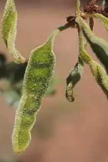 It grows as a resinous, multi-stemmed shrub or small tree, 0.6 to 7 metres (2 to 23 ft) in height, with grey or reddish-brown minni ritchi bark.[1] The plant normally has a V shaped form with an openly branched spreading crown at times with sparse foliage present. The evergreen phyllodes have an elliptic to obovate shape and are slightly asymmetrical. The blade is 10 to 32 millimetres (0.39 to 1.26 in) in length and 5 to 20 millimetres (0.20 to 0.79 in) wide and has three to five main longitudinal nerves.[2] It produces yellow flowers from April to August.[1] The simple inflorescences have fragrant, globular to obloid or occasionally shortly cylindrically shaped flower heads that are 10 to 20 mm (0.39 to 0.79 in) in length with light golden flowers. The flowers are not very densely packed in the heads and are relatively large in size. The leathery seed pods that form following flowering are brown in colour and slightly shiny. Each pod has a narrowly oblong shape and is mostly flat but raised over the seeds. The pods are 2 to 10 cm (0.8 to 3.9 in) in length and 7 to 15 mm (0.28 to 0.59 in) wide, they are sticky with resin and have a sweetly aromatic smell. The shiny deep brown seeds within the pods have an obloid-ellipsoidal shape and are 4 to 6 mm (0.157 to 0.236 in) in length and 3 to 4 mm (0.118 to 0.157 in) wide.[2]